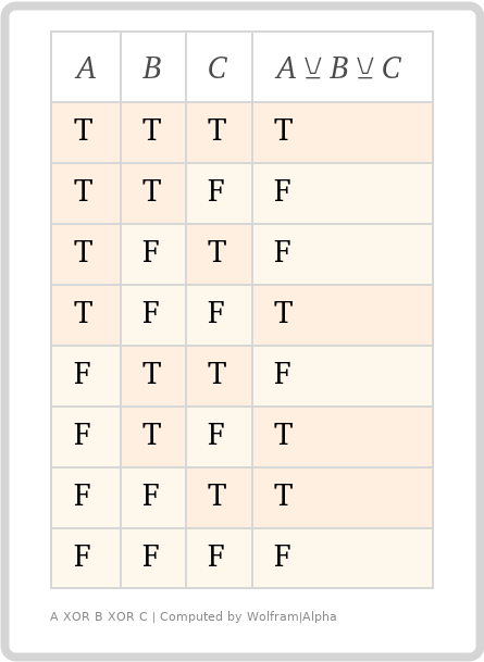 Truth Table for "oneOf" - (a xor b xor c) & ! (a && b && c)